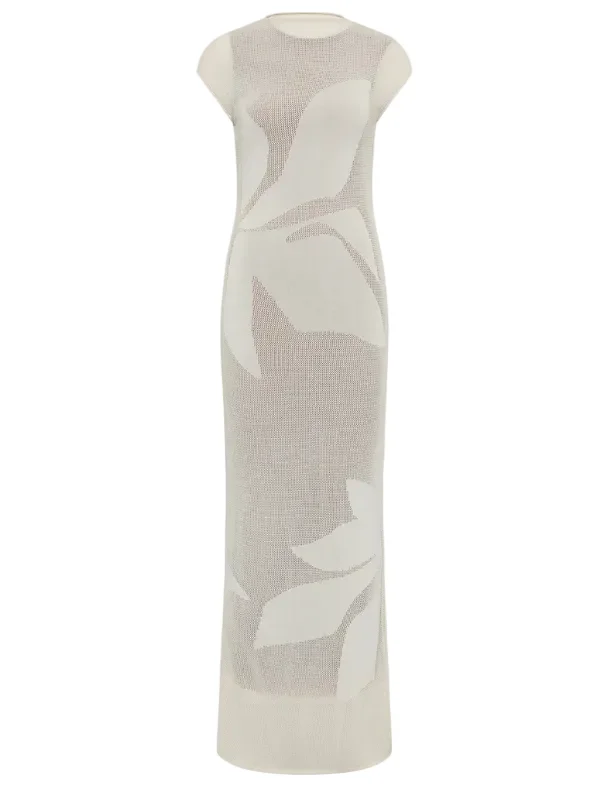 The Solange Midi Dress by SIR is a fitted and semi sheer silhouette. Crafted in knit with slight stretch to hug the body effortlessly. Featuring cap sleeves, a rolled finish and engineered flower placement for a subtle, tonal texture. Product Details: Designer ID: SIR126-7011 Color: Natural Composition: 63% Viscose, 37% Nylon Imported