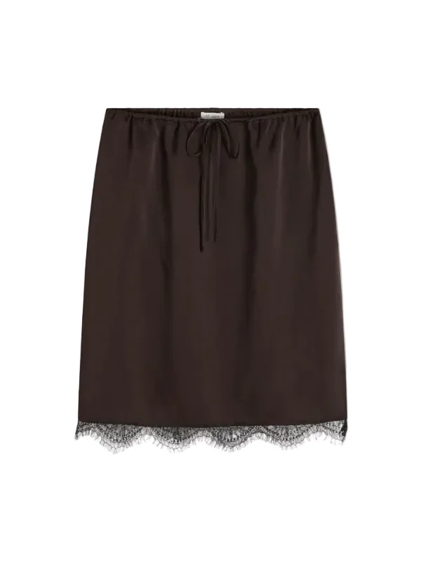 Made from fluid silk, St. Agni's Fine Lace Skirt sits low on the waist and falls to the knee, finished with a fine lace trim that adds a discreet textural note. Versatile in design, the Fine Lace Skirt transitions with ease from day to evening. Product Details Designer ID: S26-26150 Color: Bark Composition: 100% Silk Imported