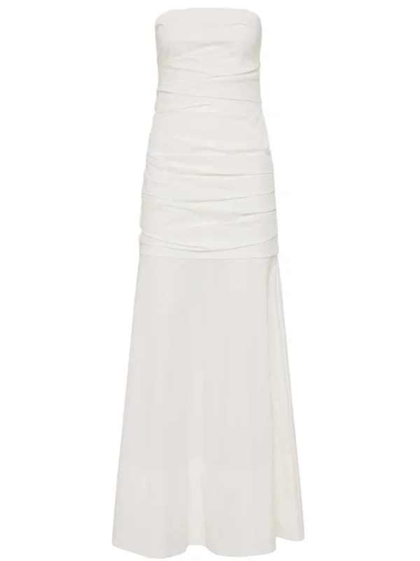 The Gathered Strapless longline dress by St. Agni is crafted from a breathable blend of cotton and recycled nylon with a fitted yoke waistband that defines the silhouette before falling into a full circle skirt at maxi length. The gathered construction enhances volume and movement, balancing structure with ease. Product Details: Designer ID: R26912WHT Color: White Composition: 66% Cotton, 31% Recycled Nylon, 3% Spandex Imported