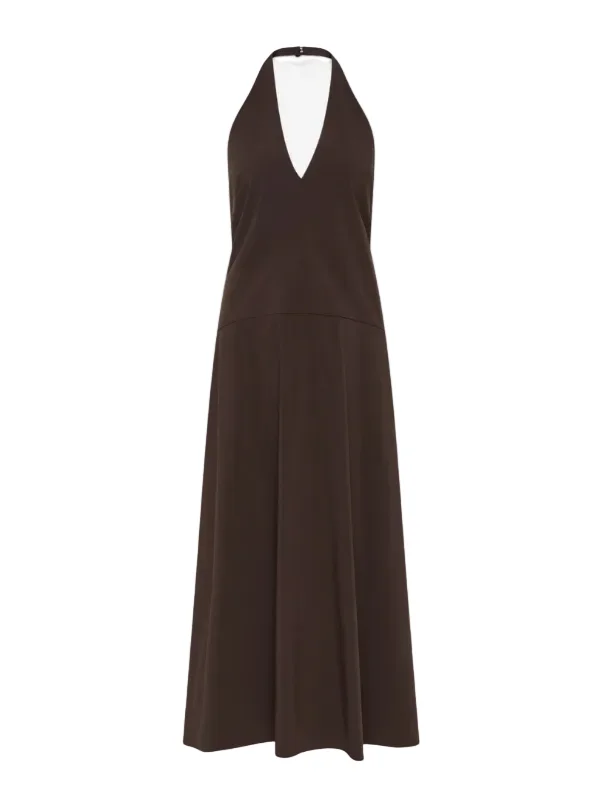 St. Agni's Halter Plunge Dress offers fluid elegance with its 7/8 length and flattering halter V-neckline. Featuring bust darts for a tailored fit and curved hip detailing that enhances its refined silhouette. A full circle skirt adds movement, while the cotton blend fabrication ensures a light, airy feel, making the Halter Plunge Dress a versatile style for both casual and occasional dressing. Product Details Designer ID: W25-904BAR Color: Bark Composition: 66% Cotton / 31% Recycled Nylon / 3% Elastane Imported