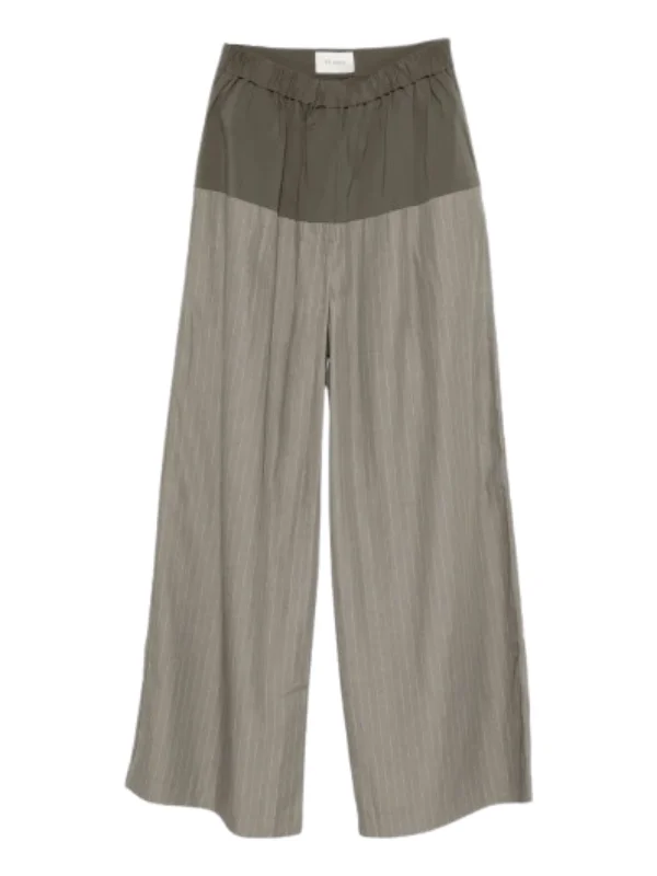 St. Agni's Relaxed Splice Pants offer an easy, wide-leg silhouette with a mid-rise and elasticated waistband. Featuring a contrast splice panel the Relaxed Splice Pants blend utility and softness for an elevated everyday staple. Product Details Designer ID: W25-503KPS Color: Khaki Pinstripe Composition: 73% Polyester, 21% Lyocell, 5% Linen, 1% Rayon Imported
