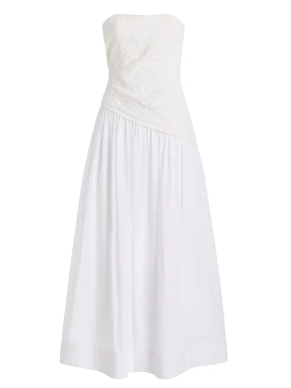 The Nia Dress by Staud pairs a smocked cotton bodice with a structured poplin skirt. Strapless at a midi length, this dress features timeless silhouette that works for any occasion. Product Details: Designer ID: R26S2281SO Color: White Composition: 99% Cotton, 1% Elastane, Trim: 90% Polyester, 10% Spandex Imported