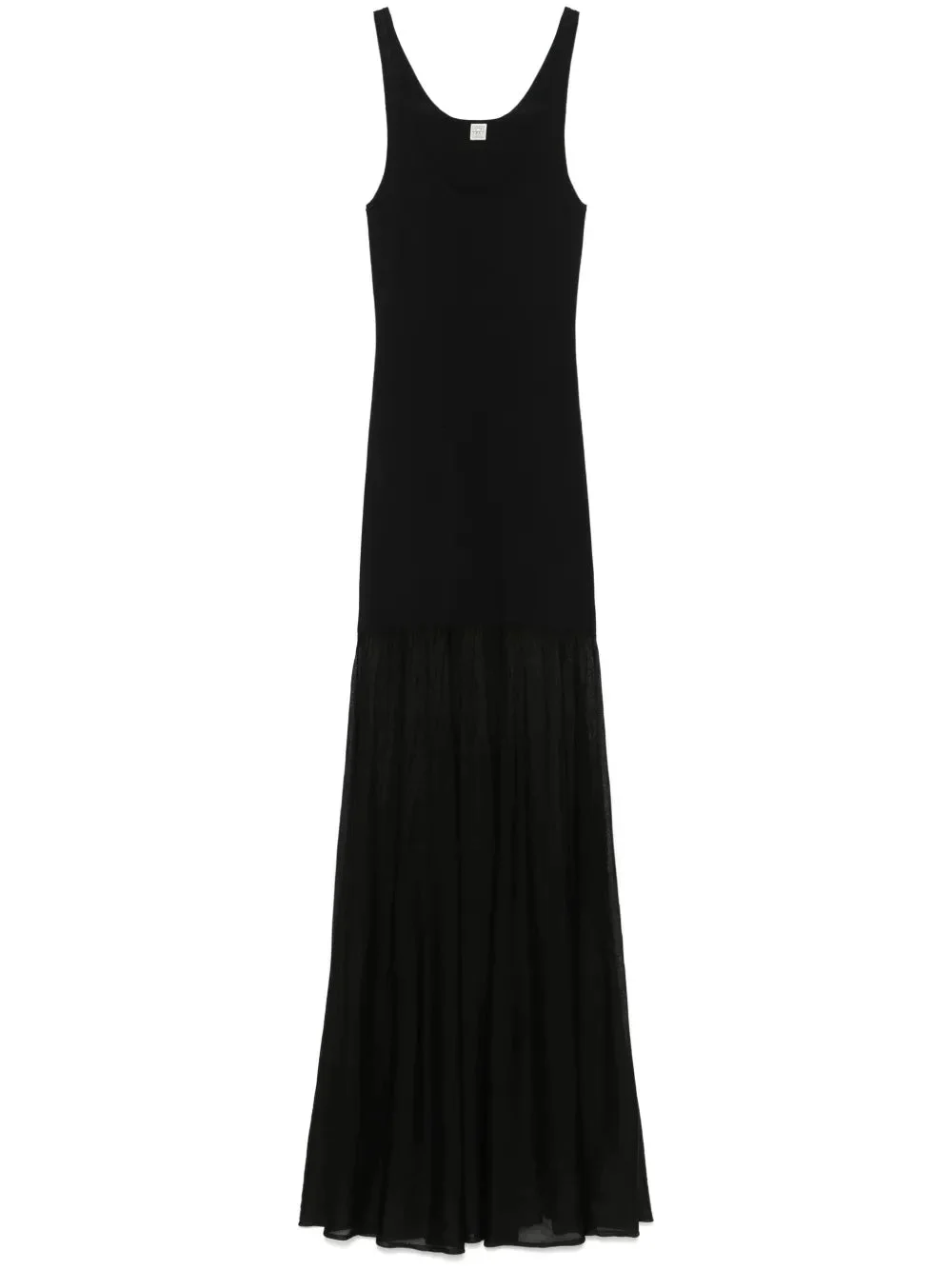 TOTEME's Evening Tank Dress is an understated evening piece. Made from compact stretch jersey, it has a tank top-inspired neckline followed by a slim waist and hips and a sheer floor-length skirt with a soft plisse finish. Choose classic jewelry as a sophisticated complement. Product Details Designer ID: 251-WRD0180-YA0138 Color: Black Composition: 89% viscose, 11% polyamide Imported