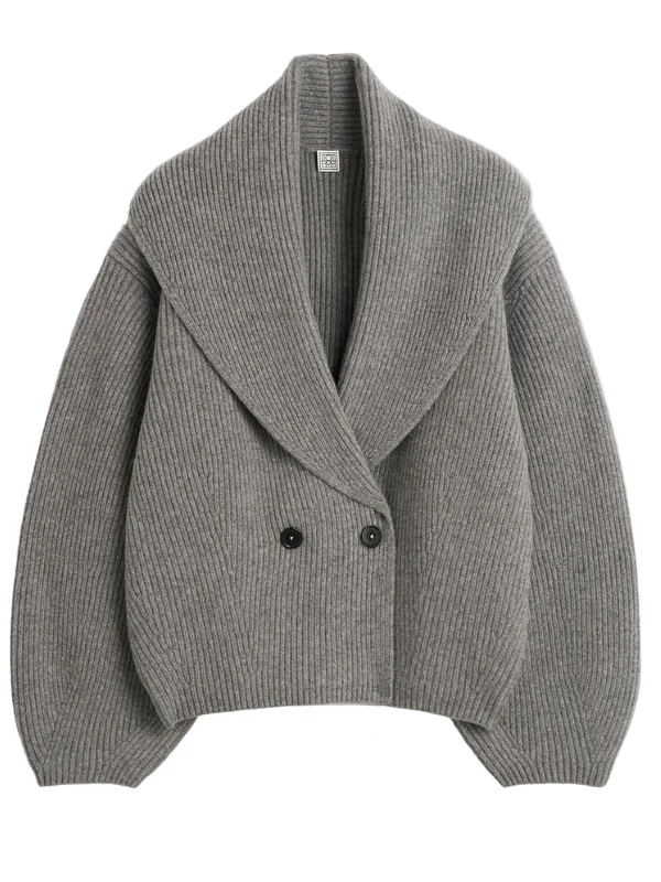TOTEME'S Shawl-lapel cardigan has wide sleeves with dramatic, rounded proportions. It is knitted from heavyweight, ribbed wool and set with a double-breasted button front. Wear it as a sculptural outerwear piece. Product Details Designer ID: 251-WRT4354-YA0239 Color: Mid Grey Melange Composition: 94% RWS Wool, 6% Polyamide Imported