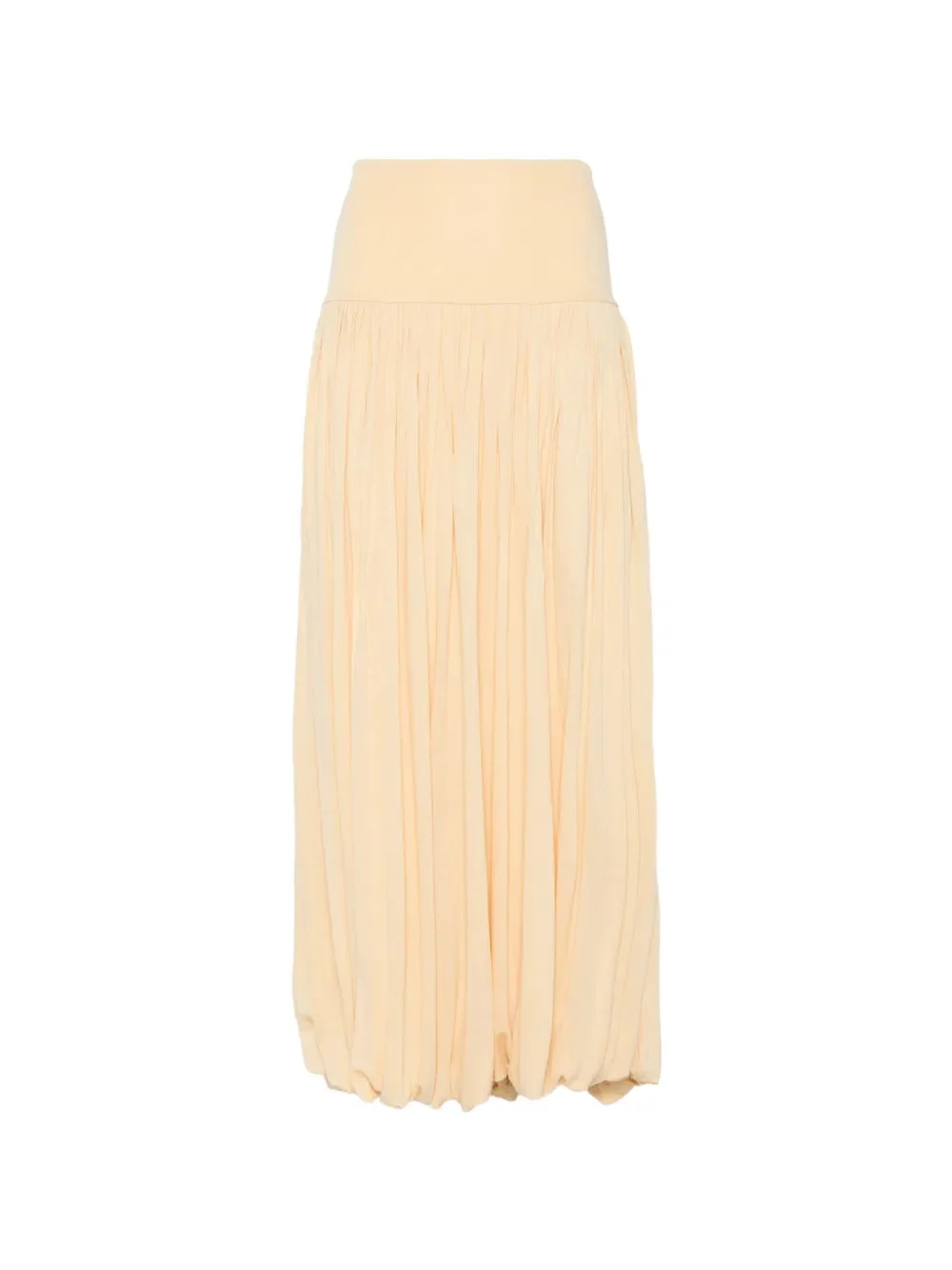 TOTEME'S Soft Gathered Skirt is a languid pull-on skirt, softly sculpted with undone precision. A double layer of translucent jersey crepe creates lightweight volume, gathering along the wide, low waistband before falling to a bubbled mid-calf hem. Balance the oversized silhouette with a fitted top and heels. Product Details Designer ID: 262-WRB0395-FB0635 Color: Champagne Composition: 100% viscose Imported