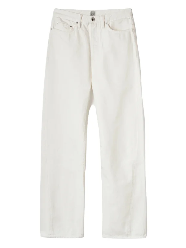 Twisted Seam Jeans were the first style in TOTEME'S denim collection and remain a signature to this day. Directional side seams add movement and give this silhouette their relaxed, straight-tapered shape. A versatile wardrobe piece. Low waist intended to sit on the hip with a dropped rise, straight leg, full length. True-to-size for a relaxed look; go down a size or two for a closer, higher-waist fit Product Details Designer ID: 231-240-748 Color: Off-White Composition: 100% organic cotton Made in Italy