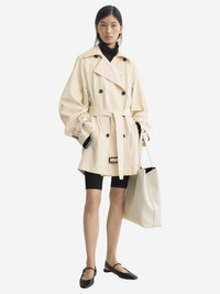 TOTEME's Washed Cotton Trench is a double-breasted trench in washed cotton cut soft and loose to sit above the knee. Finished with exaggerated lapels, a back yoke, and tonal belts that cinch at the waist and cuffs. Wear with a mini and flats to accentuate the graphic silhouette. Product Details Designer ID: 262-WRO0288-FB0605 Color: Stone Composition: 100% organic cotton Imported