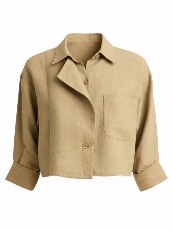 TWP's Next Chapter is a cropped button-front top crafted in washed linen. Fabric is made of 100% flax linen, with a washed finish and soft touch. The Next Chapter features a relaxed, boxy silhouette with a classic point collar and asymmetrical front placket. Finished with a chest patch pocket and our signature double roll button cuffs. Product Details Designer ID: 55312W503 Color: Kelp Composition: 100% Linen Made in USA