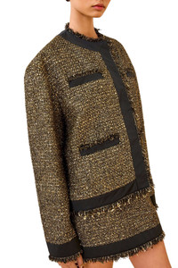 Ulla Johnson's Carmella Coat from Look 5 on the AW25 runway reinterprets classic tweed, developed in Italy with glittering lurex interwoven with soft wool-blend yarn. This beautifully tailored, black and gold jacket is framed by lustrous taffeta trims and pairs with the Aleena Skirt for modern elegance. Product Details Designer ID: FA250518 Color: Tapestry Composition: 48% polyamide, 25% polyester, 10% virgin wool, 10% acrylic, 7% metallized polyester Imported