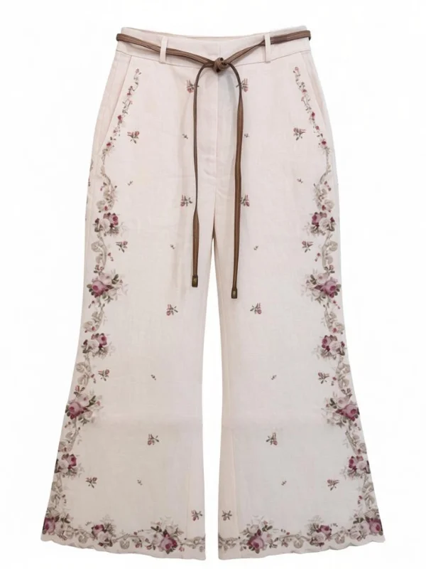 The Patience Flare Pant from Zimmermann's Resort Swim 2026 Collection. A linen pant featuring a placement print and flared legs. Product Details Designer ID: 5380PRS264 Color: Cream/Pink Rose Composition: 100% Linen Imported