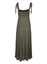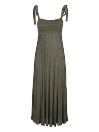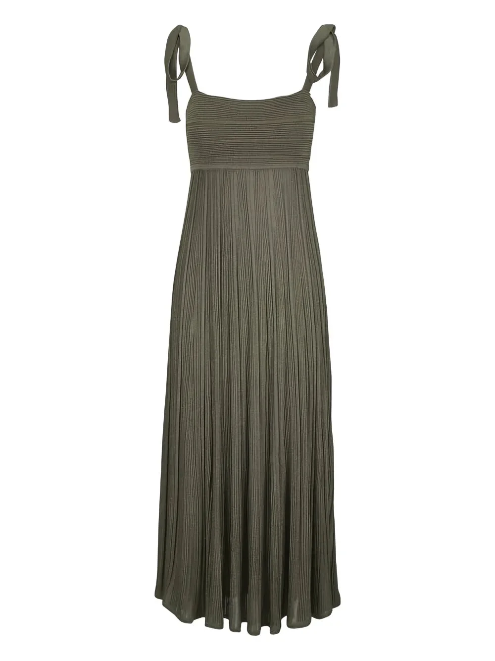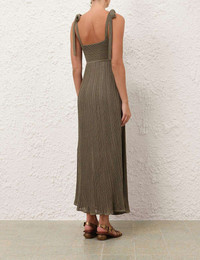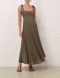 The Wanderlust Metallic Maxi Dress from Zimmermann's Resort Swim 2026 Collection. A knit midi dress featuring self-tie straps and a pleated skirt. Product Details Designer ID: 4311DRS262 Color: Metallic Olive Composition: 89% viscose, 6% metallic, 5% nylon Imported
